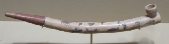 Shown above is an Inupiaq pipe made about 1900 from ivory, wood, and paint. The art work on the pipe shows a walrus hunt in which the hunter appears to be using an atlatl. This pipe is about eight inches in length. This is on display in the Portland Art Museum.