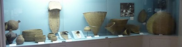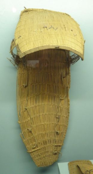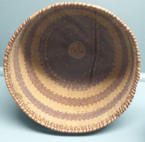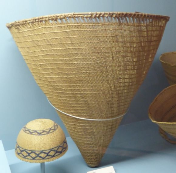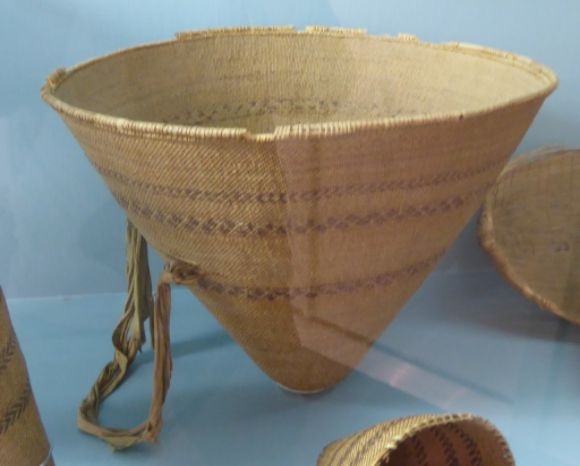 Shown above is a cooking basket: the basket would be filled with water and food and then hot rocks would be added. The rocks would be moved around in the basket to prevent them from burning the basket.