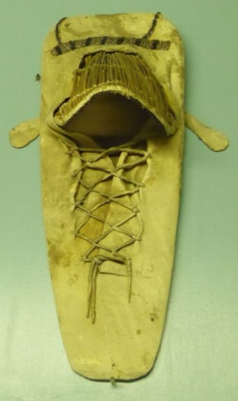 “Paiute cradles were typically made of willow. Animal skin wrappings or straps were used to secure the baby to the board. A sun shade to shield the baby’s face was patterned differently depending on the baby’s sex. Boys’ cradles had a series of slanted parallel lines and girls had zigzag or diamond patterns.”