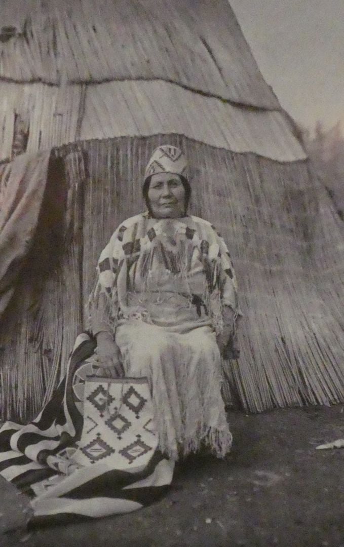 Edna Kash-Kash poses before a mat house on the Umatilla Reservation.