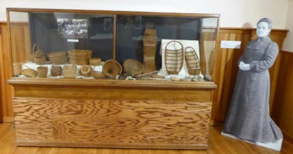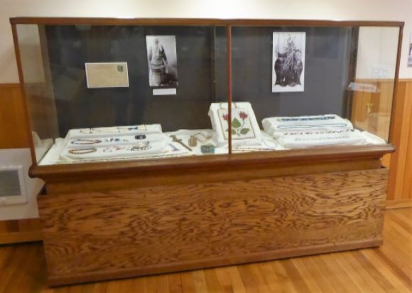 The Siletz Room in the Burrows House Museum in Newport, Oregon, contains baskets and beadwork from the Clarinda G. Copeland (1852-1929) Collection. Born Clarinda Gertrude Kisor, she married Professor James Chambers in 1870 and in 1883 they moved to the Siletz Reservation where James served as trader to the Confederated Tribes of the reservation. When he died in 1884, she became the only woman in the United States granted a license to trade with Indians. In 1889, she married W. C. Copeland and moved out of the area.