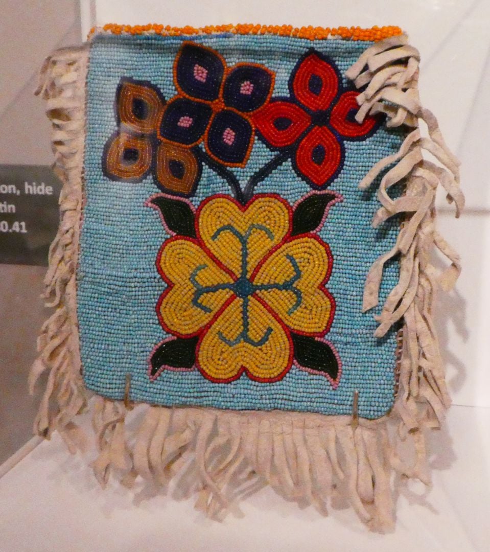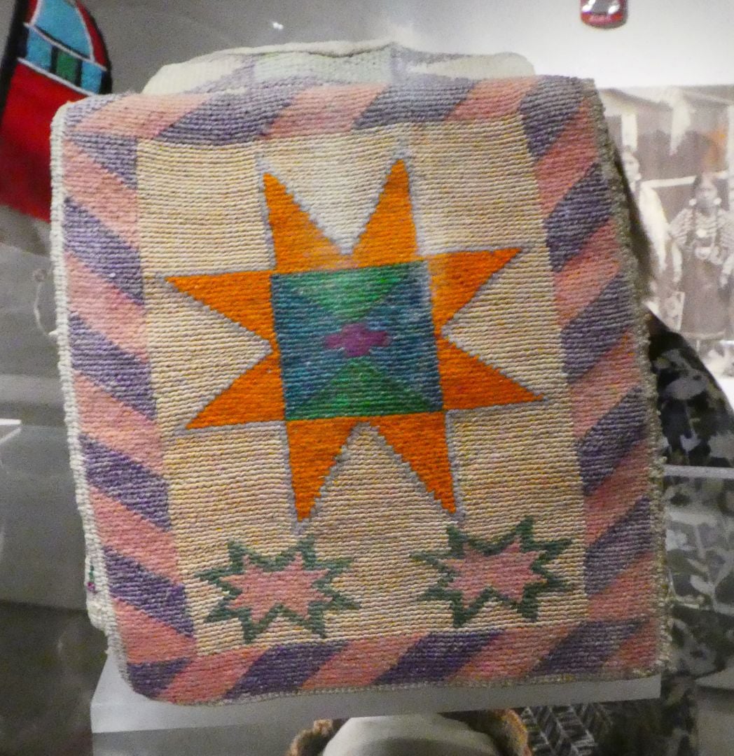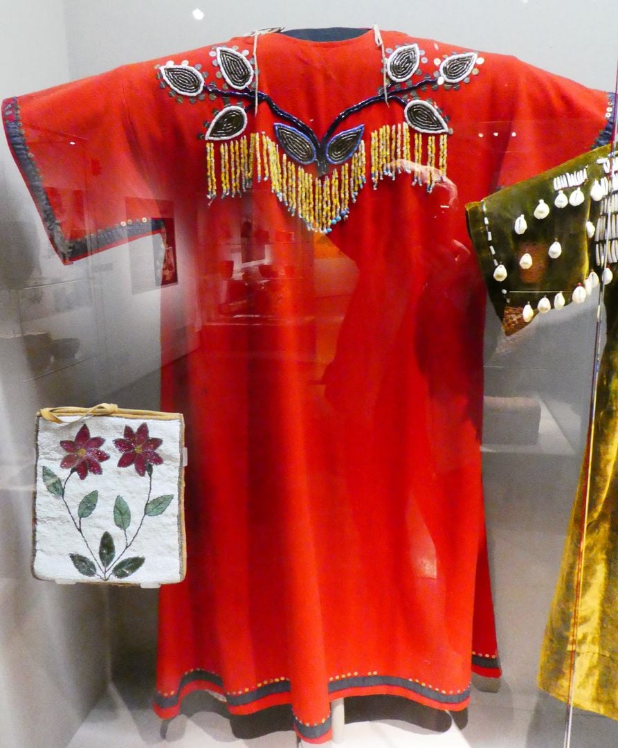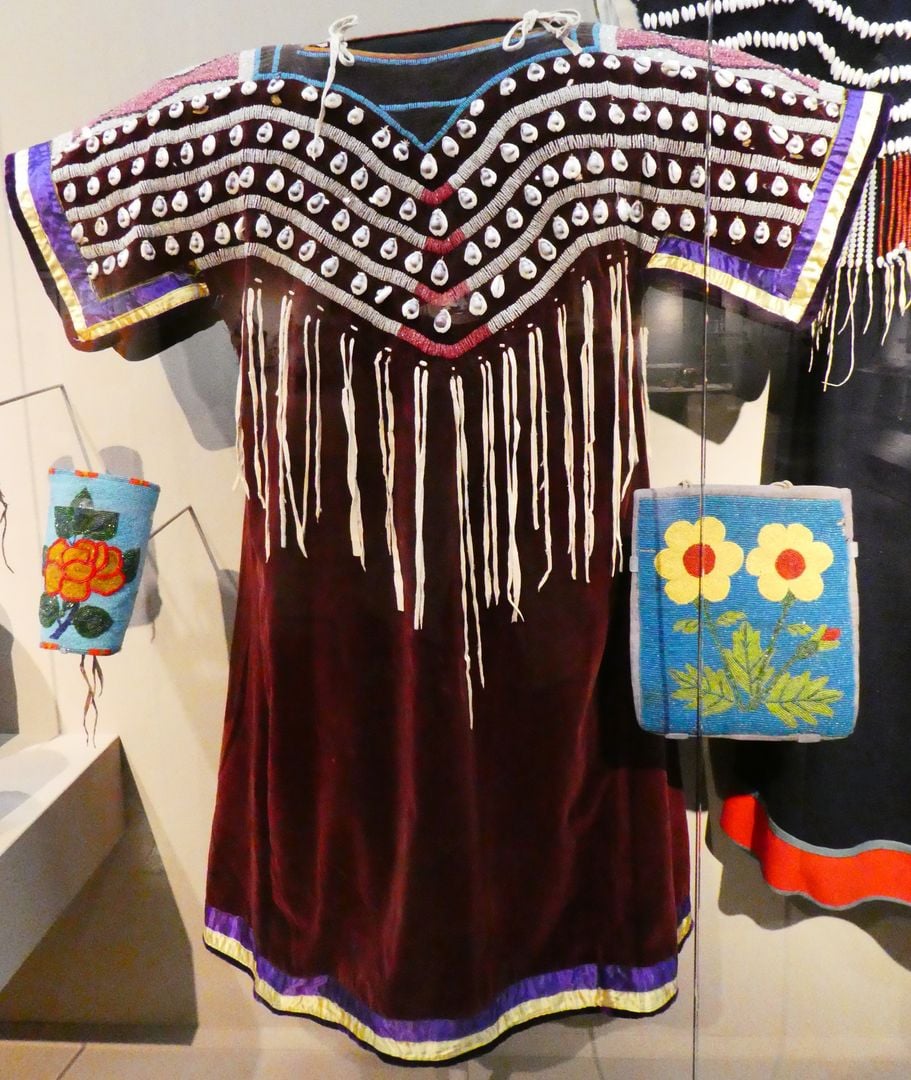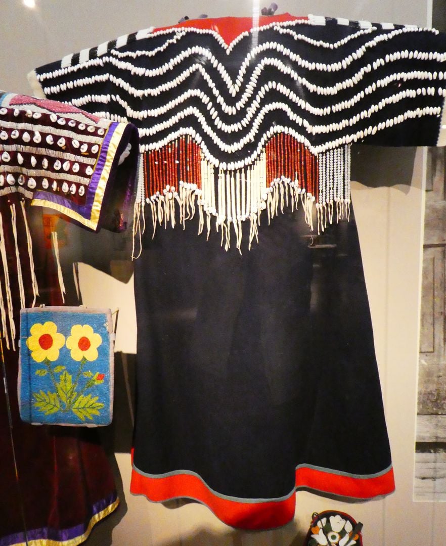 Shown above is a beaded wool dress from the Flathead Reservation and a woman’s beaded bag.