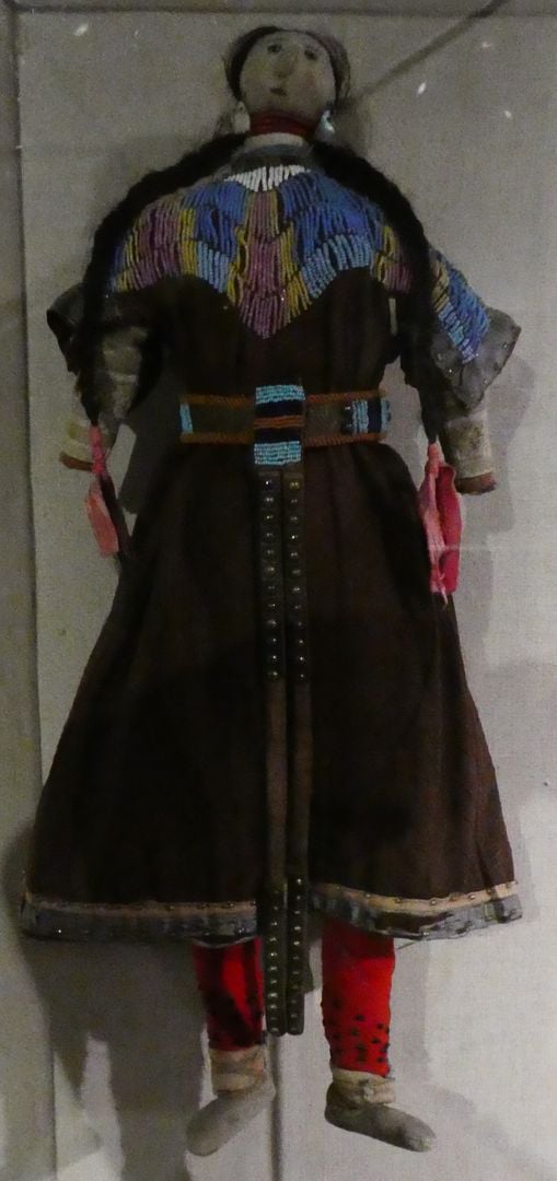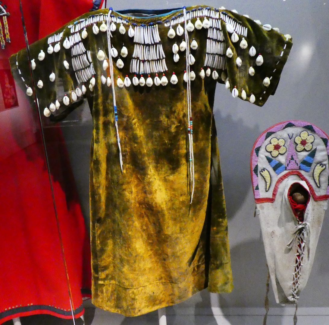 Shown above is a cloth shell dress and a toy Nez Perce cradle board.