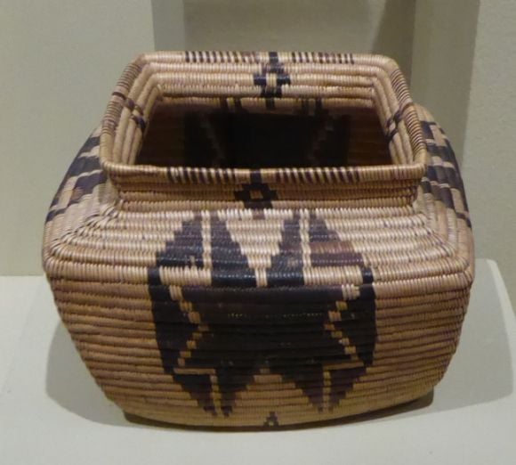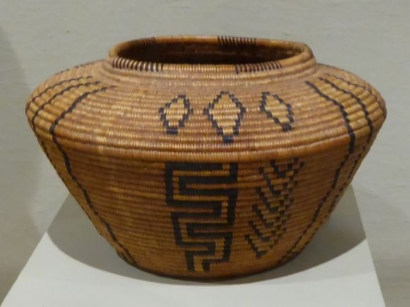 Shown above is an example of a Timbisha Shoshone basket which is on display in the Portland Art Museum. It is made from willow, desert bulrush, and devil’s claw.
