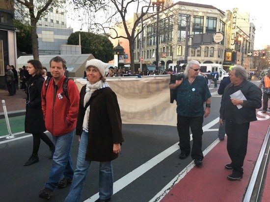 navajo in the lead, Claudia, citisven and Meteor Blades. (I think MB is thinking how much he would like to see Hamilton that is playing at the Orpheum Theatre.) citisven, Claudia, Meteor Blades and linkage marching up Market Street in San Francisco at the Native Nations Rising event on March 10, 2017. — Photo by Neeta Lind aka navajo