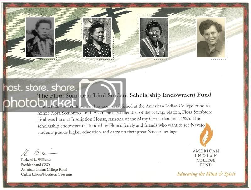 In honor of my mother, THE FLORA SOMBRERO LIND NAVAJO ENDOWMENT FUND has been set up to accept your donations. This scholarship endowment has been established at the American Indian College Fund to honor Flora Sombrero Lind, as an enrolled member of the Navajo Nation who was born at Inscription House, Arizona of the Many … Continued